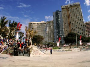 Skatepark de North Beach à Durban. Modules en béton en front de mer avec une ambiance surf et skate.