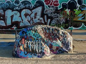 Skatepark de Waitangi Park à Wellington. Modules en béton face au port, souvent balayé par le vent du détroit.