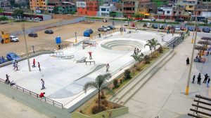 Skatepark Costa Verde à Lima, en bord de Pacifique. Modules en béton avec vue sur l’océan et le malecón.