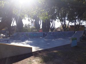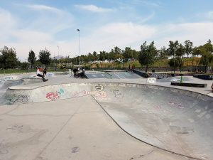 Skatepark du Parque de los Reyes à Santiago du Chili. Grand espace en béton au cÅ“ur d’un parc urbain populaire.