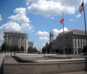 Freedom Plaza à Washington DC, spot de street iconique. Larges espaces en marbre avec ledges et gaps naturels.