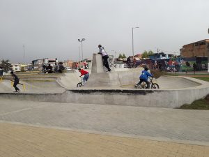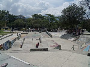 Skatepark Fontanar à Bogota. Modules en béton modernes dans un complexe sportif en altitude.
