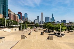 Spot de street au Grant Park de Chicago. Ledges et marches en granit au cœur de la ville.