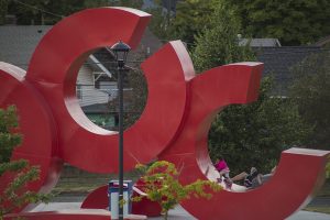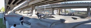 Plaza skatepark de Vancouver avec des modules street en béton. Ledges, rails et manual pads face à la baie.