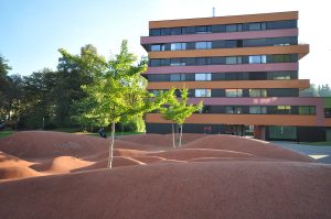 Skatepark du Reese Park à Hambourg. Modules en béton modernes avec un bon flow entre les sections.