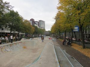 Skatepark de Westblaak au centre de Rotterdam. Bowl et modules street dans un environnement urbain dynamique.