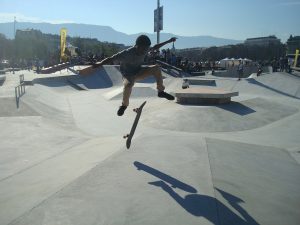 Skatepark international au bord du lac. Vue sur les Alpes.