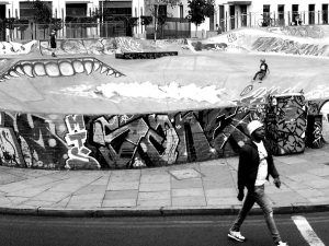 Skatepark DIY communautaire avec bowls. Ambiance underground londonienne.